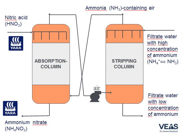 One evocative case is the recovery of nitrogen (N) by VEAS, a large integrated municipal waste water treatment plant (WWTP; 650,000 P.E.) in Oslo, in cooperation with Yara, a mineral fertilizers and industrial / environmental solutions company. A substantial fraction (12-15%) of the total N load entering the VEAS plant is recovered – after anaerobic digestion (AD) of sludge, lime conditioning and filter pressing stages – via ammonia stripping and subsequent capturing (scrubbing) of the ammonia gas (NH3) with a concentrated nitric acid solution (HNO3 – 62% w/w). This stripping and scrubbing treatment yields an industrially reusable ammonium nitrate (AN – NH4NO3) side stream. Yara acts as a key-enabler in this circular business model through supplying the nitric acid and receiving the AN side-stream.